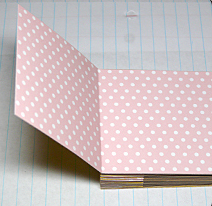 - Углы цветной бумаги срежьте так, как показано на рисунке. Заверните края цветной бумаги внутрь заготовки и приклейте к картону. Все, обложка готова.