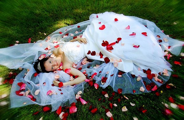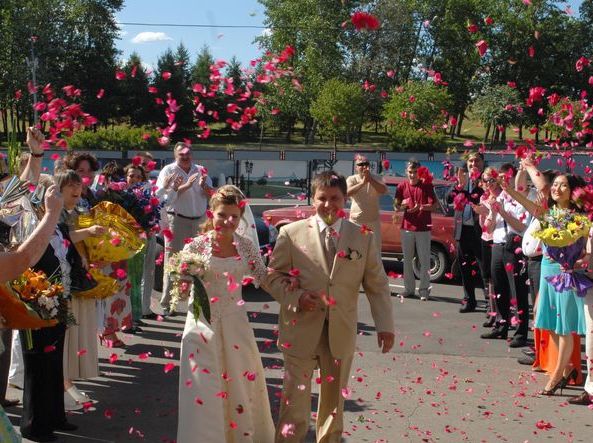 Но, тем не менее, подумайте, какая фотография Вам понравится больше: с рисом, где молодожены морщатся и закрывают глаза, пытаясь поскорее сбежать из-под «золотого дождя» или же с лепестками роз, когда и супруги, и гости восхищенно смотрят в небо, наблюдая за плавным падением лепестков роз?..