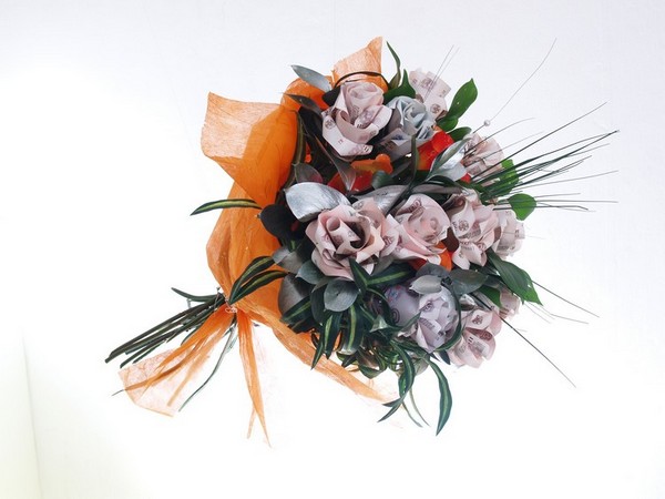 Букет из денег. Это будет отличной альтернативой классическому букету из цветов. Используя технику оригами, специалисты создадут для вас настоящий шедевр, который вызовет восторг у всех гостей. Мастера умело сочетают цвета и воссоздают малейшие детали настоящих цветов исключительно из купюр. Более того, вы сами сможете сделать подобный подарок, опираясь на инструкции, которые просто найти в Интернете в огромном множестве.