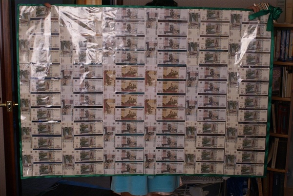 Денежный ковер или скатерть. Для создания такого подарка понадобятся маленькие прозрачные файлы. В один файл помещаются 3 купюры. Скрепите все файлы в один большой прямоугольник, и вас получится отличный, а главное полезный ковер, или «скатерть самобранка».