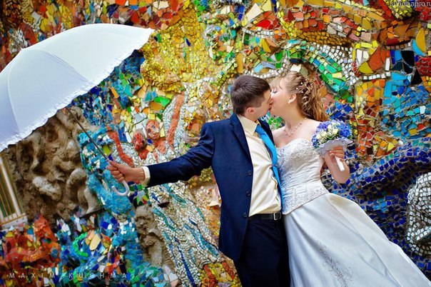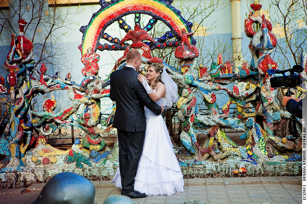 Дворик украшен мозаикой из разноцветного стекла – как по мановению волшебной палочки скамейки, поребрики и небольшие скульптуры заиграли новыми красками. Объекты, заполняющие дворик, имеют различные сюжетные линии, но чаще всего здесь встречаются фигуры людей, ангелов и львов. Работы имеют явную гуманистическую направленность и заставляют не только смотреть, но и думать.