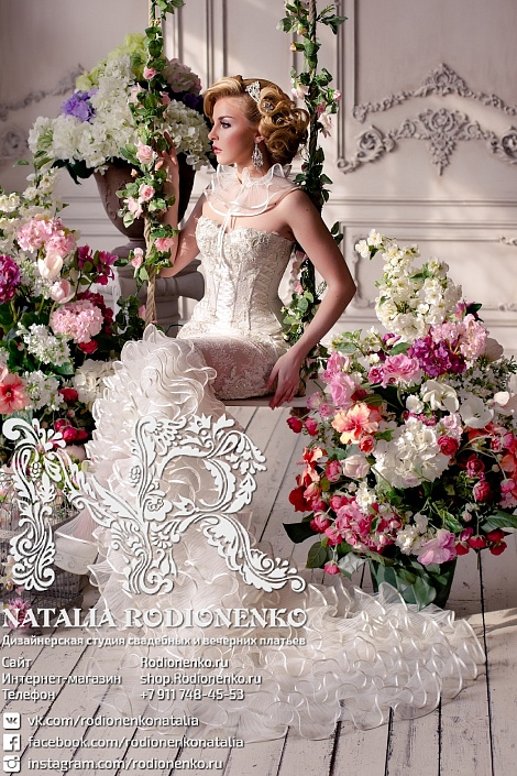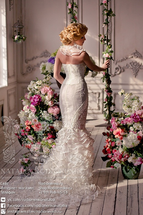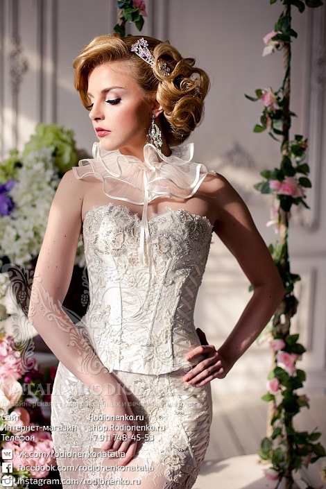 В этом свадебном комплекте из юбки и корсета любая девушка будет выглядеть робкой нимфой, притягательной и недоступной. Сочетание шелковой тафты и кружев создает образ мимолетного видения, которое может в любой момент рассеяться. Узкая юбка по фигуре и корсет на шнуровке подчеркнут вашу грацию и красоту. Уникальный стиль и фасон юбки подчеркивает сложный узор из художественных линий.Эффект усиливает декоративная шнуровка из атласной тонкой ленты, линии которой плавно огибают всю фигуру. Они начинаются на корсете, в районе груди и плавно очерчивают линии тела, сужаясь в области талии и снова расширяясь уже на юбке в области бедер. Завершается шнуровка внизу на спинке юбки у линии колен игривыми бантиками из тонкой атласной шелковой ленты. Дополнительно корсет украшен фактурными кружевными элементами расшитыми бусинами, пайетками и бисером и еще одной декоративной шнуровкой по центру переда. Юбка так же имеет декоративные элементы из кружева с объемным цветочным дизайном и расшитого бусинами и бисером. Нижняя часть юбки ниспадает водопадом воланов ,которые созданы из полупрозрачного гофрированного фатина. Сказочность и эффект от наряда усиливает длинный шлейф. Туалет завершает воротник из гофрированного фатина. Цвет:айвори Размер 42,есть в наличии,другие размеры под заказ
