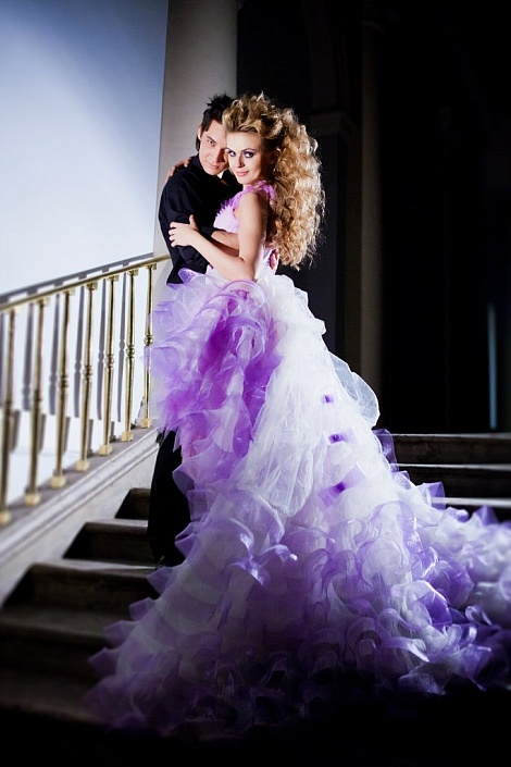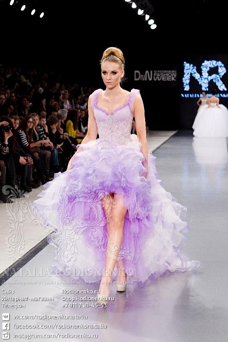 Восхитительное свадебное платье цвета айвори и легкой дымки сирени,окутает вас нежным очарованием , словно облако, . Юбка короткая спереди,но с длинным роскошным шлейфом, создана из множества воланов из гофрированного фатина. Каждый волан обрамлен по краю региленом нежного сиреневого цвета, что придает юбке форму и в то же время создает эфемерный, невесомый образ. Корсет в платье сделан из полупрозрачного кружева с изящным цветочным орнаментом. Шнуровка по середине спинки и бретели с рюшами делают его посадку плотной и позволяют скорректировать фигуру в еще более идеальную форму: создать точеную, кукольную фигуру. Вшитые чашечки второго размера формируют грудь в безукоризненную область декольте, которая слегка прикрывается рюшей по краю лифа. Весь корсет декорирован кружевным элементом густо расшитым стразами и кристаллами Swarovski