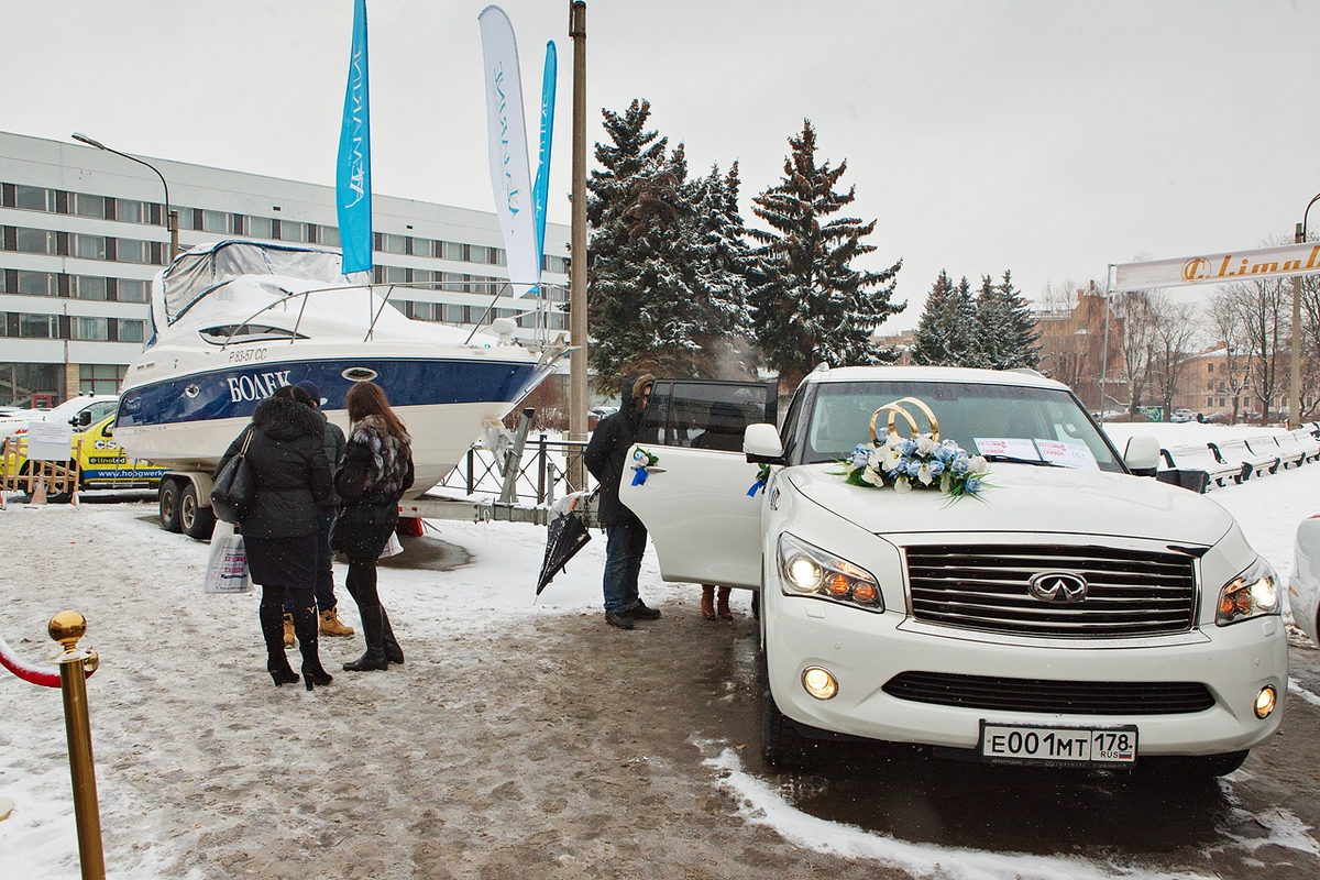 Влюбленным также удалось попасть на крупнейшую в городе выставку автомобилей на праздник, которая располагалась перед входом в «Azimut-Отель», и заказать со скидкой свадебный кортеж. Для гостей были представлены: лимузины, автомобили представительского класса, ретро, Bar Bus…