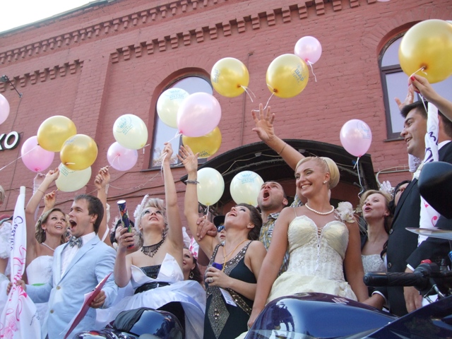 Завершилась свадебная прогулка у ретро-клуба «Пионер»: после коллективных фотографий на фоне двух стильных спортивных мотоциклов, невесты выпустили в небо десятки воздушных шариков!