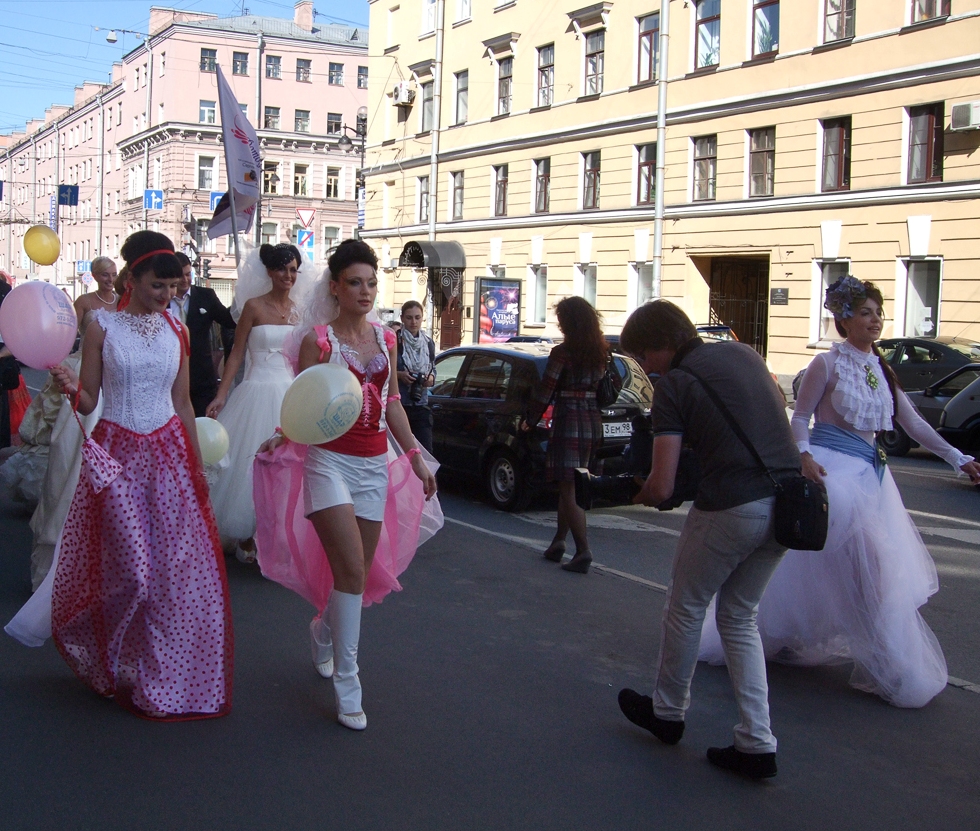 Ни один свадебный фестиваль не обойдется без флеш-моба на Невском проспекте! Так же случилось и вчера. Десятки принцесс в роскошных белоснежных платьях прошлись от дома № 105 по Невскому проспекту к Полтавской улице.