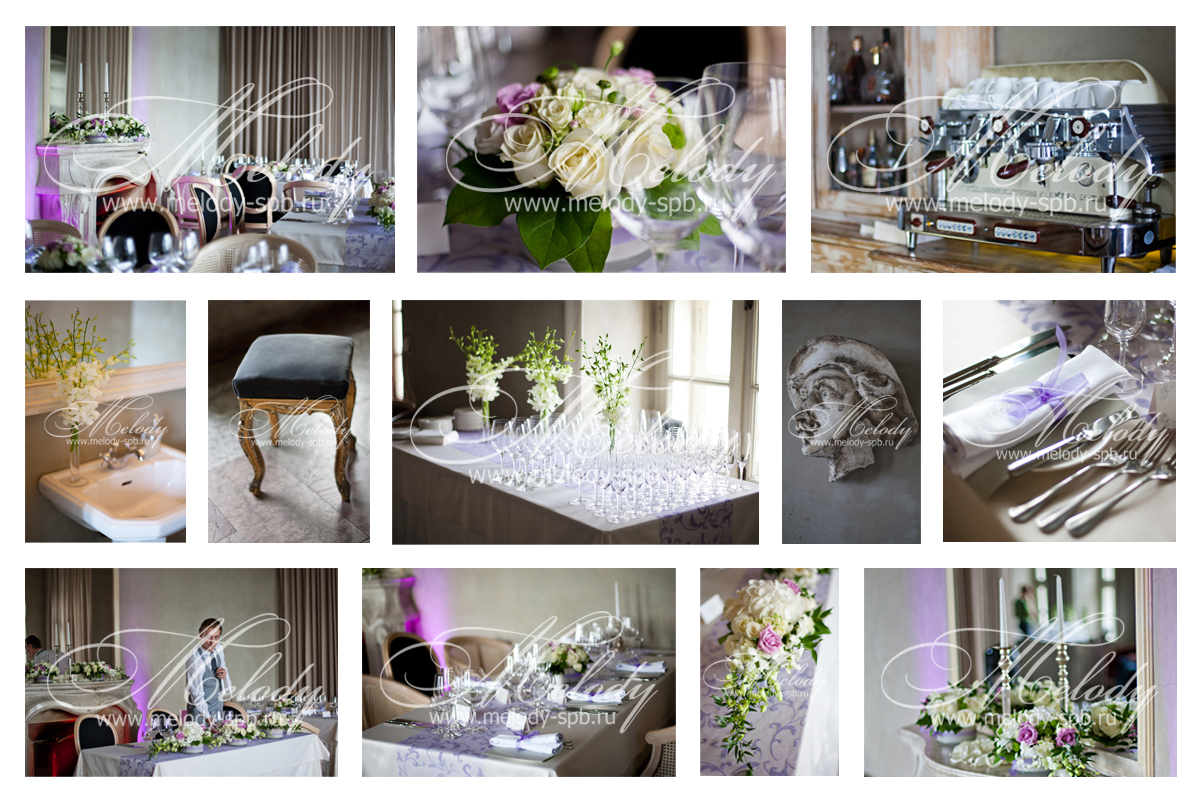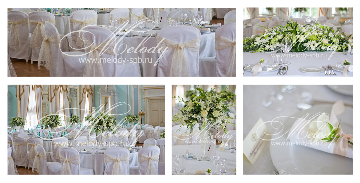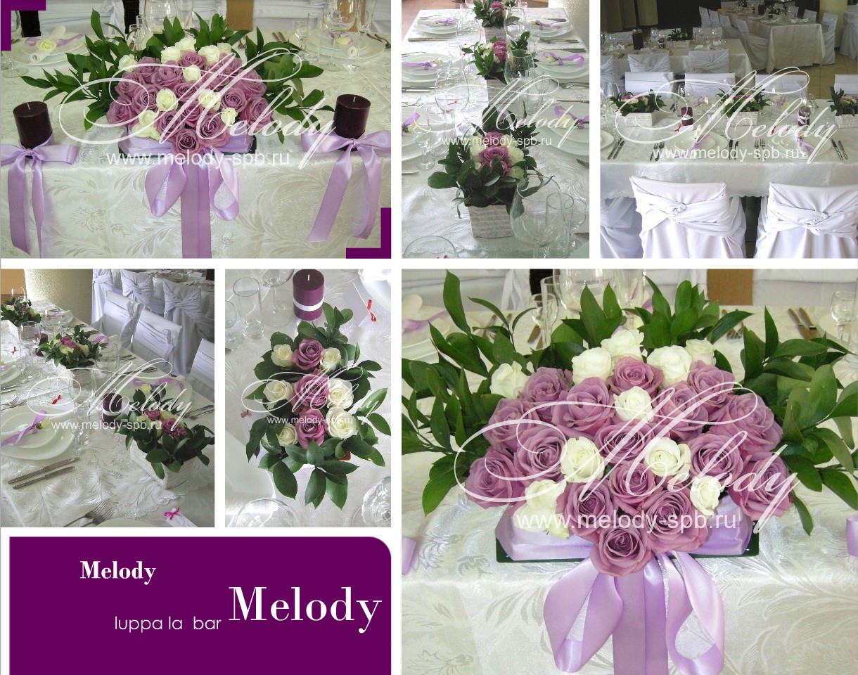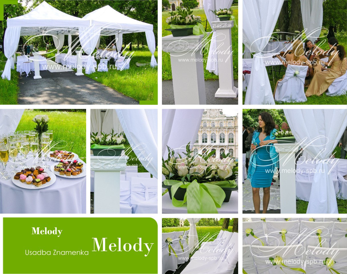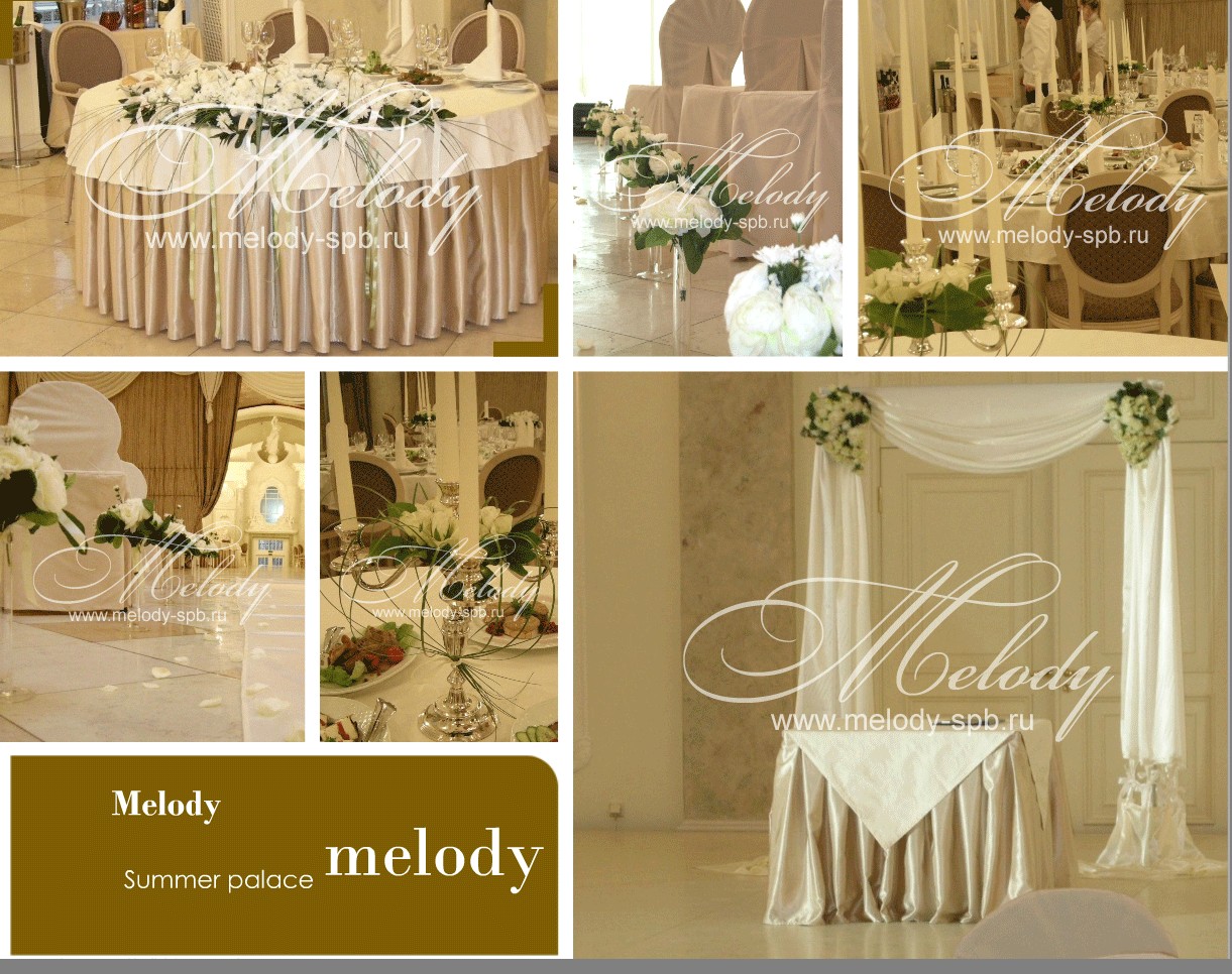 Как студия дизайна и декора - Mélody оформит самый требовательный свадебный банкет или торжественный прием эксклюзивными комплектами декора, столового белья, цветочными композициями и даже живыми бабочками, которые будут порхать вокруг ваших изумленных глаз. Возведет белые шатры на сочно-зеленой траве в самых известных или укромных местах Санкт-Петербурга и его пригородах…
