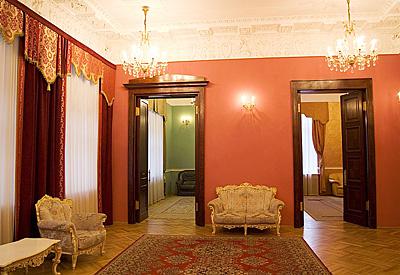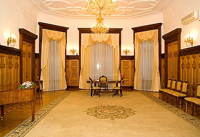 Во Дворце сохранена атмосфера старинного особняка. Вы почувствуете это сразу же, попав на парадную лестницу, имеющую прекрасное обрамление из инкрустированного натурального дерева. В гостиных Вы можете насладиться прекрасной старинной лепкой, обрамляющей потолки. Стены зала отделаны натуральным деревом с прекрасной резьбой по карнизам.